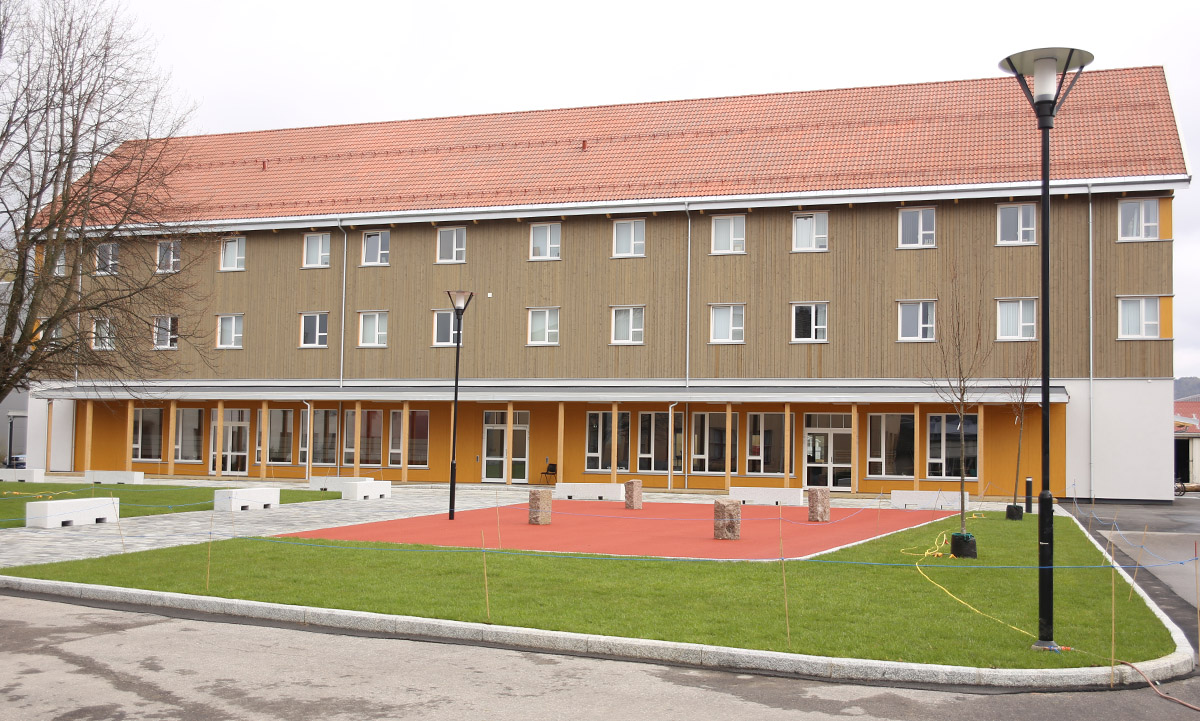 Dette er leiligheter som er organisert på samme måte som på C, men her er det fire leiligheter i hver korridor i et to etasjes bygg. I enden av korridorene er det en stue og utgang til veranda. Det er ikke terrasse til hver leilighet. I andre etasje har rommene hems, det har de ikke i første.